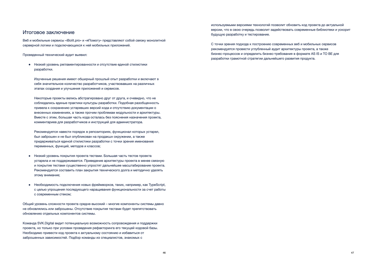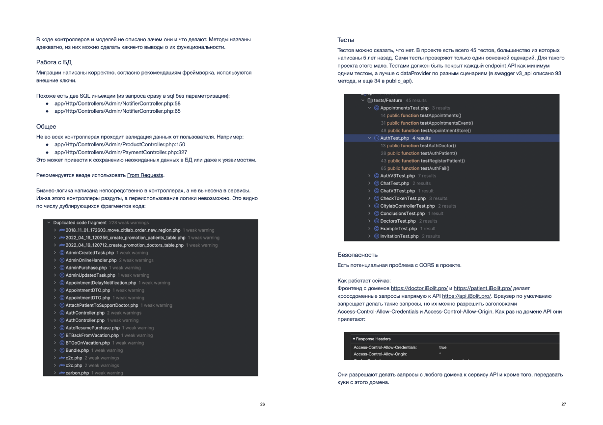 Анализ качества кода, покрытия тестами, актуальности версий используемого ПО и фреймворков, производительности веб и мобильной версии. Проверка cтепени документированности кода и его масштабируемости.